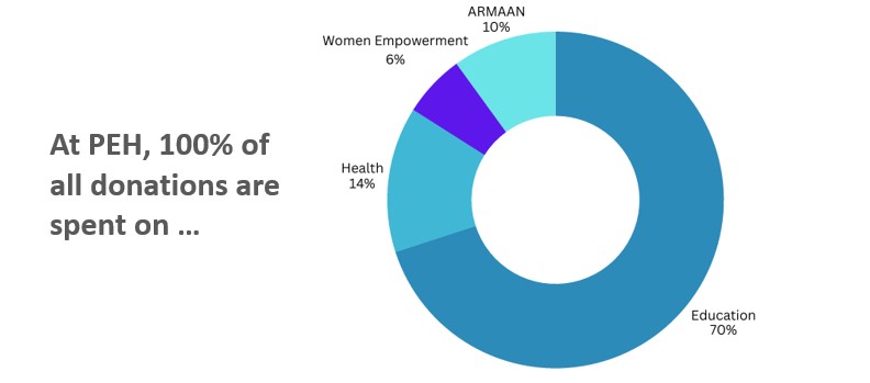 It is extremely important to know that ALL funds collected go directly to fund the child's education and related needs and/or towards other Programs. PEH DOES NOT deduct anything from your donation for any kind of administrative expense. 100 cents on the dollar directly benefit the children and other Programs!! Your contribution is tax-deductible.